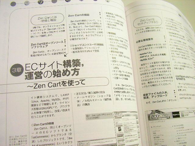 後半では、オープンソースの活用事例としてオンラインショップ構築ソフト「Zen Cart」の特徴を紹介し、インストール・セットアップ、デザインのカスタマイズ、追加モジュールの説明など初歩的な内容を概観しています。