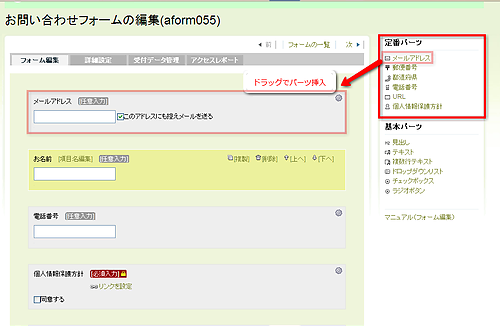 A-Formのフォーム編集画面を開くと、右サイドボックス部分に、挿入可能なフィールド(入力項目)が、「定番パーツ」「基本パーツ」の2グループに分かれて並んでいます。