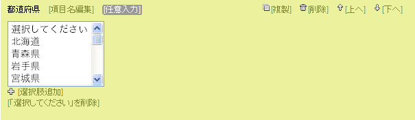 あらかじめ47都道府県が選択肢にセットされたプルダウンメニューです。選択肢は編集可能です。都道府県以外の選択肢(例えば"海外"とか"中央区"とか)を追加したり、不要な県があれば削除・変更できます。