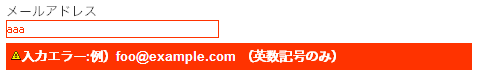 メールアドレス書式チェック機能付きの1行テキスト入力欄です。例えば「@」の入力忘れや、誤ってひらがなや漢字を入力するとエラーメッセージが表示されます。アルファベットや数字、「@」「-(ハイフン)」などは全角入力可能で、自動的に半角数字に変換されます。