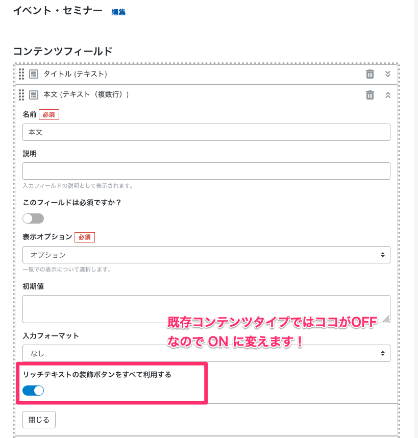 「テキスト(複数行)」フィールドの項目を開き、「リッチテキストの修飾ボタンをすべて利用する」を有効にします。